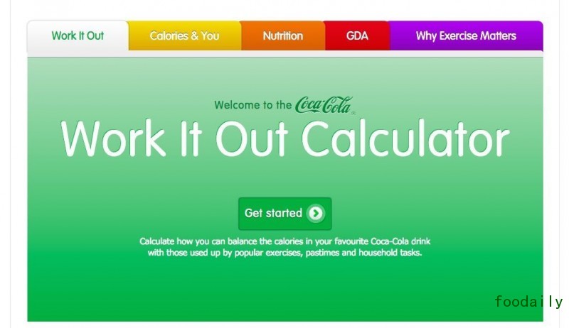 比如在“健康”栏目中,可口可乐开发一个有关卡路里的交互测试,名为 Work It Out Calculator。它能够告诉消费者的是,喝完一瓶可乐后,需要做什么样的运动来消耗掉这些卡路里。