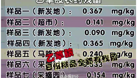 如果参照欧盟标准0.05毫克每公斤,那这些检出的样本里边,1号草莓样品乙草胺的最高残留量是0.367毫克每公斤,超标了7倍多,就连残留最低的3号样品,也超标了大约1倍。