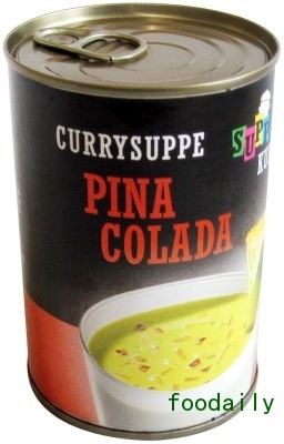 1、Supp Kultur Currysuppe冰镇果汁朗姆酒:冰镇果汁朗姆酒形式的咖喱汤(德国)。此咖喱汤用椰奶,菠萝和朗姆酒制成,铝制易拉罐装,390ml。可以热食或冷用。