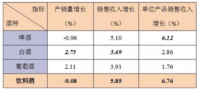 在饮料酒中,啤酒是唯一出现产量下降的主要酒种,在饮料酒中所占比例下降至75.2%,比上年降低了1.6个百分点。由于啤酒所占比例仍是最大的,啤酒产量的负增长导致了饮料酒总产量也出现了-0.08%的微幅下降。