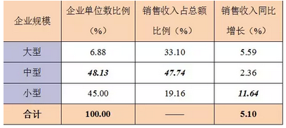 从表五中可以看出,大型企业数量最少,销售收入占总额比例较高,增长稳定,符合规模化效益的特点;中型企业与小型企业数量比例相当,但增幅却大相径庭,小型企业增长较快,中型企业增长较慢。