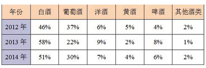 表十 2012年~2014年酒类产品在淘宝网和天猫网销售额所占例