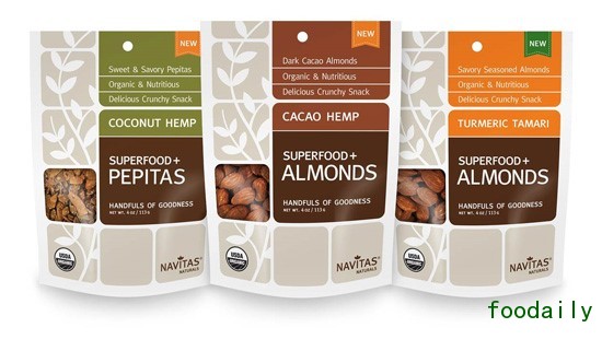 Navitas Naturals向其颇受欢迎的有机零食系列中添加了三种超级食品+果仁和坚果:可可火麻仁、椰子火麻瓜子、姜黄焗杏仁。这类主打“果仁+坚果”的超级食品不仅能够带来营养,还能应用到不同食谱中来提升口味,如沙拉、甜点、混合食物等。