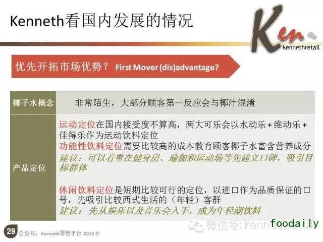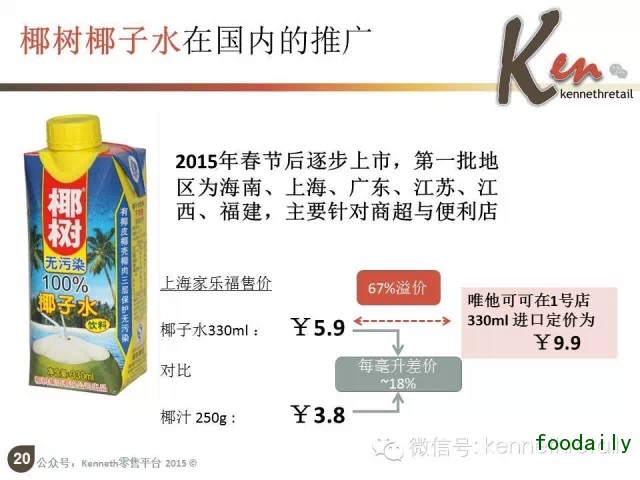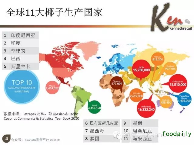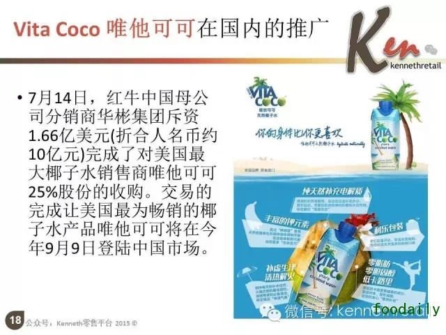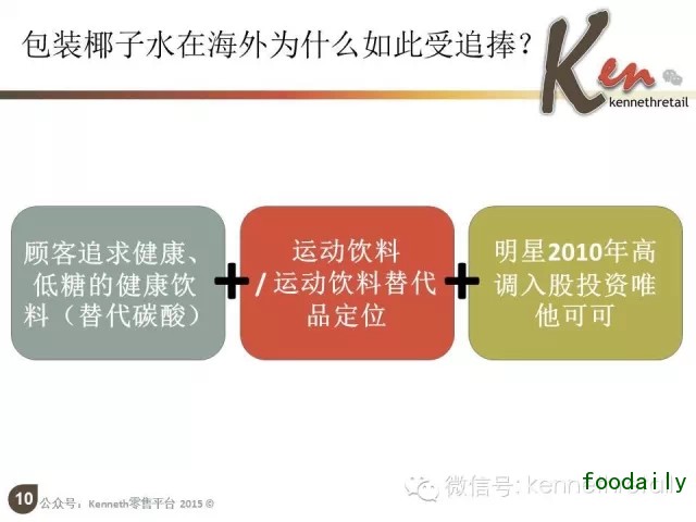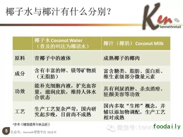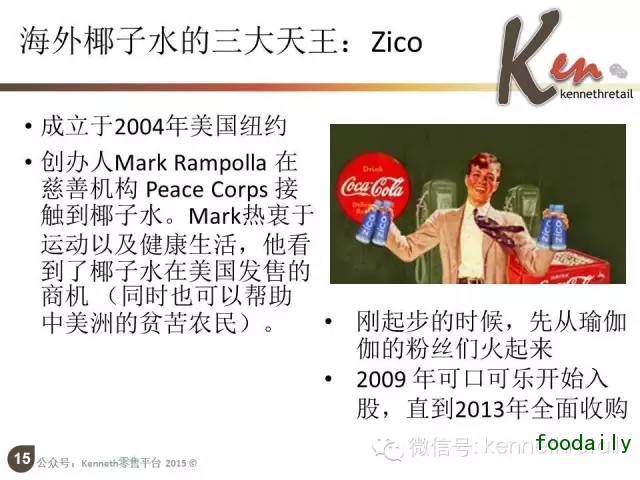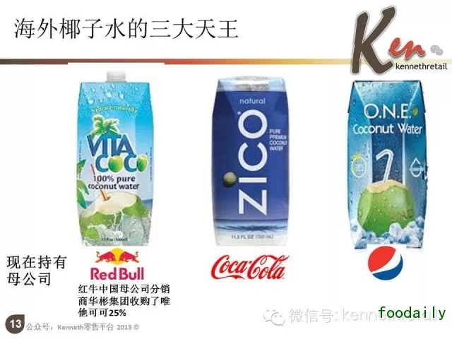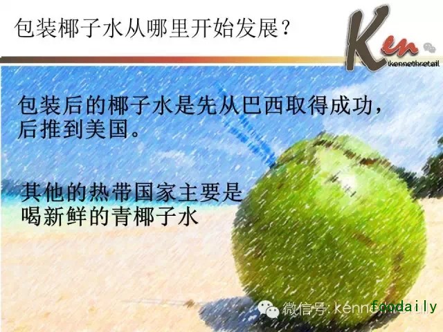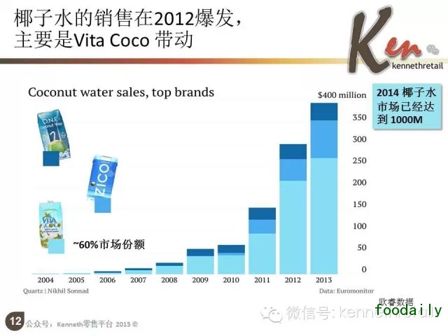 椰子水,2004年几乎是 0 的市场; 2013年在全球已经达到了4亿美金销售,2014年更突破了10亿美金 (1 billion US$)