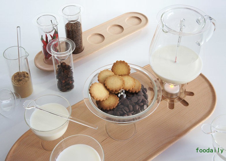设计师 Sebastian Bergne 最近推出了一个“迷你实验室”,方便人们制作各种饮料。其中 Hot Milk Lab 专门方便人们在热牛奶里面加入各种配料,制作出不同风味的饮料。Sebastian Bergne 的这一套实验室由木制的托盘和不同型号的玻璃瓶,酒精灯以及托盘组成,烧牛奶的玻璃瓶中放置了一个温度计,可以方便使用者调节温度。