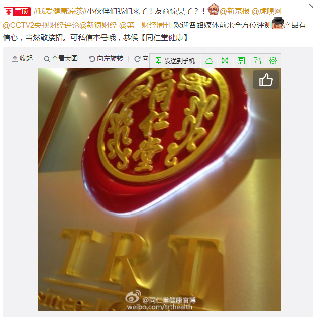 从这些微博的蛛丝马迹看得出来同仁堂是准备向前辈致敬的。首先,微博命名,叫同仁堂健康,嗯这是致敬广药的,广药旗下的王老吉大健康产业就是经营王老吉凉茶的,这到是挺好的。两个中国知名的药企,都是56年公有制改革化归国有所有,广药最开始叫王老吉联合制药厂,而同仁堂则一直是叫同仁堂,双方现在的企业也都是与最初的创始人没有什么关系。广药中没有一个王老吉的后人在,同仁堂中乐家后人也就是在同仁堂挂个顾问的头衔。其次,同仁堂凉茶的包装是黄色,比较符合同仁堂御医的身份。