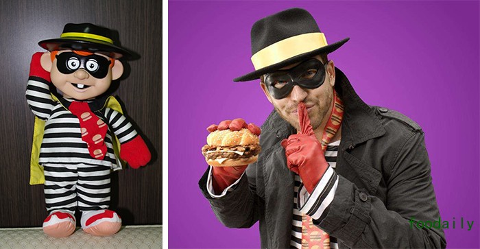 不只是“国王”,麦当劳和肯德基今年都陆续召唤回曾经的吉祥物。穿着黑白条纹 T 恤(难道不是囚服吗?)、带着眼罩的汉堡神偷以真人形象登场,帮助麦当劳推广“牛里脊汉堡”。桑德斯上校也为了肯德基的 85 年生日,带来了新口味的吮指原味鸡。显然,吉祥物们的复出都是为了唤起消费者们的童年记忆,那个时候大家都还挺爱吃快餐的,不是吗?