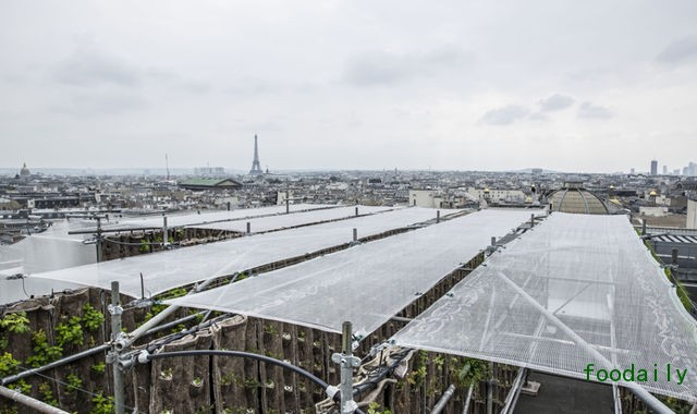 旗舰店屋顶大约有 5400 平方英尺(合约 500 平方米,不到一亩),三月份法国无土栽培协会就进驻安装了无土栽培系统,利用羊毛和麻作为基质,承诺不使用任何化学药品,并对灌溉系统进行循环回收利用,目前种植了超过 150 种水果、花卉和蔬菜。这个屋顶农场会保留到明年 10 月份。这些收获的花卉植物和水果蔬菜等都会被分发到与“城市农场”倡议有合作的厨师手中,这被称为“巴黎草莓”(Paris sous les fraises)。