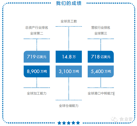 总资产达719亿美元,行业排名全球第二。总营业收入718亿美元,行业排名全球第3。年经营量1.46亿吨,行业排名全球第4。拥有全球仓储能力3,100万吨,加工能力8,900万吨/年,港口中转能力5,400万吨/年。这些数据表明,中粮已经发展成为与ABCD比肩的国际化大粮商,初步具备了利用国际市场和全球资源服务国家粮食安全的能力。