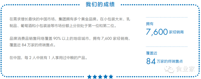 品牌消费品销售网络覆盖90%以上的地级城市,拥有7,600家经销商,覆盖近84万家的终端售点。在中国,每2人中就有1人享用过中粮的产品。