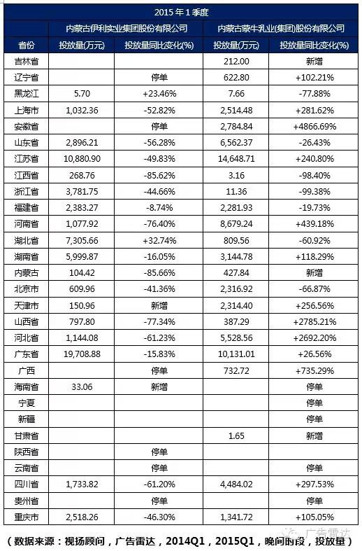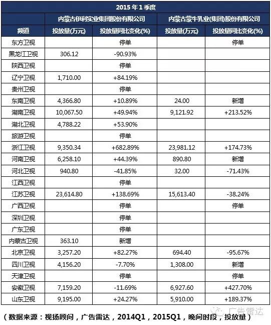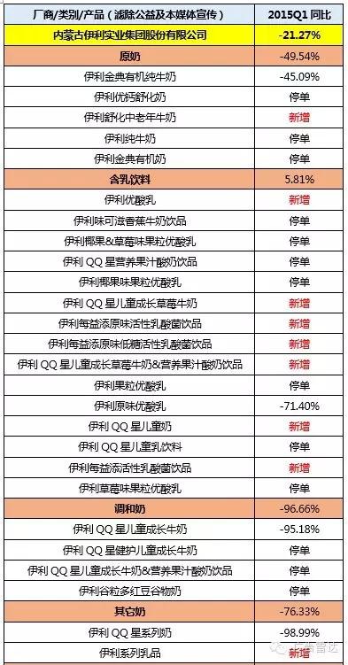 2015年一季度电视硬广刊例投放数据来看,伊利同比下滑-21.27%,原奶类产品投放下滑-49.54%,投放量仍在旗下各类产品中居首位。值得一提的是,伊利希腊安慕希酸奶投放同比增长927.40%,含乳饮料、植物蛋白饮料的增量和新增投放,产品投放结构的优化调整可见一斑。