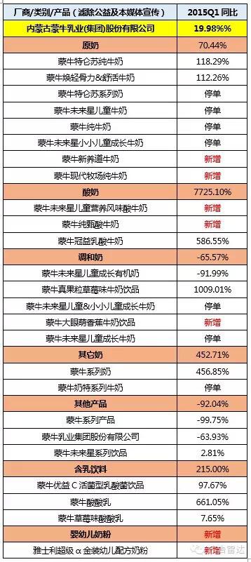 2015年一季度产品投放细分,蒙牛同比增长伊利下滑