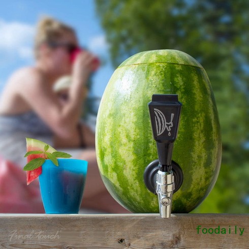 三、好,现在拿个杯子,拧开水龙头,像享用啤酒桶里的啤酒一般,开始享用西瓜桶里的西瓜汁吧!
