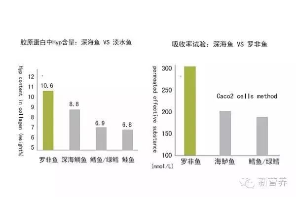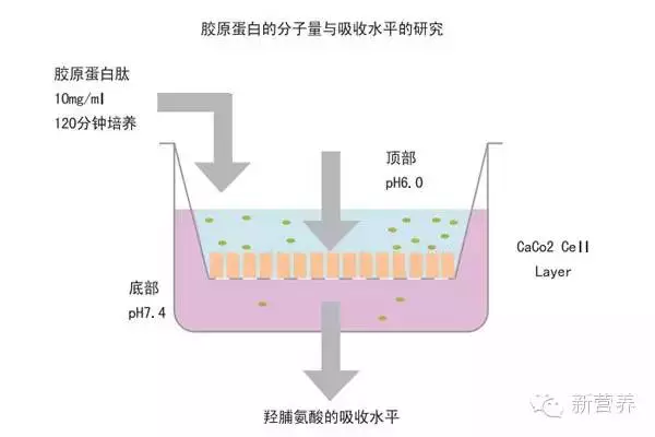 很多厂家标榜自己的产品分子量小,因此更易吸收。但新田公司采用了目前国外广泛用来研究药物小肠吸收率的体外模型“Coca2 细胞试验法”(Caco2细胞模型是近十几年来国外广泛采用的判断药物在体内吸收率的标准化筛选工具)。针对市面上不同公司、不同来源的胶原蛋白的吸收率进行对比试验,结果发现:胶原蛋白肽的吸收率与分子量大小无绝对的反比关系,所以,分子量小的胶原蛋白吸收率不一定高。胶原蛋白的吸收率只取决于吸收后进入人体中的功能性二肽含量, 而该功能性二肽的多少则取决于生产工艺。