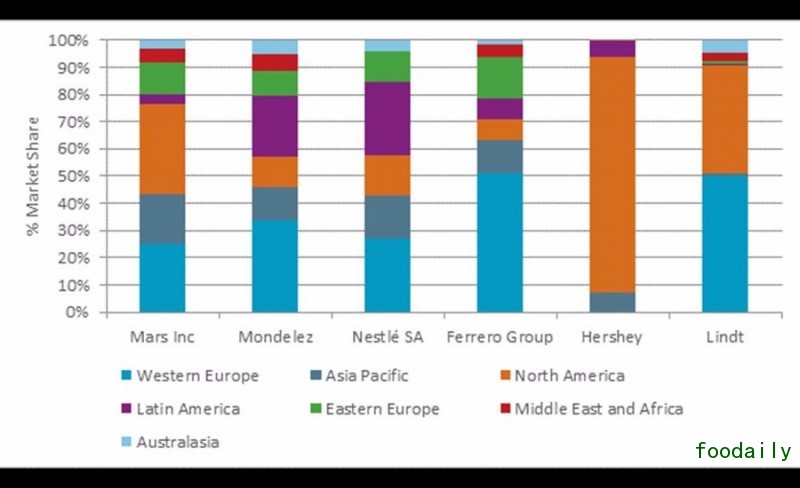 其在高端市场的主要竞争对手瑞士莲,由于近期收购了美国糖果企业Russell Stover,所以受到的影响较小。鉴于对北美地区的极端过度依赖,排名前10的糖果公司中,好时毋庸置疑的取得了最好结果, 2015年的增长达4%。仅在美国,好时的销售额就达到了80%以上。