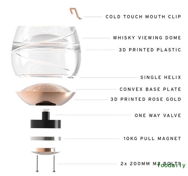 在失重环境下,液体就像一个弹跳的果冻一样难以控制,研发团队根据离心原理在酒杯中铺设了吸管轨道和旋转磁盘,让宇航员可以就着送酒口啜饮杯中的液体。用玫瑰金打造送酒口,是考虑到塑料制品的气味可能会影响到品酒的口感。