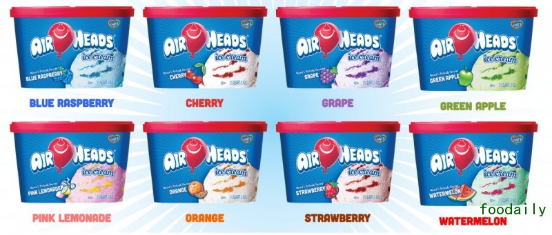 Airheads冰淇淋有覆盆子,樱桃,西瓜,橙子,青苹果,粉红柠檬,葡萄和草莓8种独特的风味。冰淇淋还与Airheads太妃色带混合,创造了前所未见的组合。除了冰淇淋,Airheads系列美味冷冻甜品包括以下以冰淇淋为基底的冷冻新品:第一款DitZ冰淇淋迷你杯,圣代杯,冰淇淋三明治和冰淇淋压榨管。