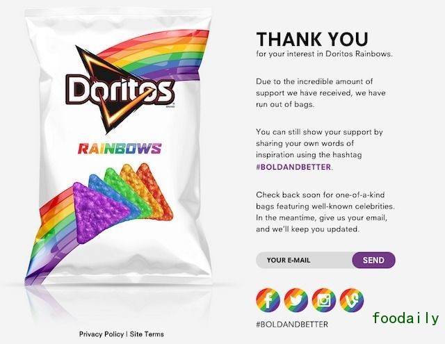 如果现在你再想要表示对 LGBT 人群的支持,只能转发一张“彩虹玉米片”的图片,再加上 #BOLDANDBETTER 的 Tag 了。