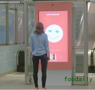可口可乐在瑞典斯德哥尔摩的地铁站里放了一个电子广告牌,内置了面部识别系统。如果过往的乘客对着广告牌做出表情,广告牌上由可乐瓶、瓶盖、吸管组成的笑脸就会模拟出同样的表情。