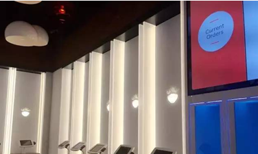 点完餐之后,在餐厅上方的一块LED屏上,每位顾客都可以看到自己的名字,当食物制作完成后,你只需要根据上面的编号走到对应的格子面前即可。