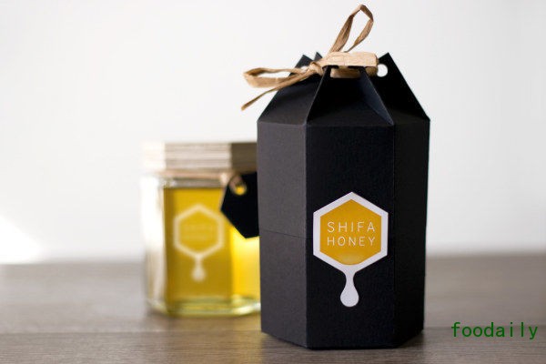 六角蜂房也是蜂蜜的一大特征,想来其他的瓶装液体也很难驾驭六角形的瓶身。Shifa Honey 唯一的特殊之处是由一角滴出的蜂蜜,打破了平衡,也构成了它的标签。设计师称“Shifa ”在阿拉伯语是治愈的意思,他们想以此提高人们的健康意识,用蜂蜜取代糖,而设计灵感来源于蜂蜜本身的高纯度。