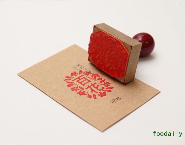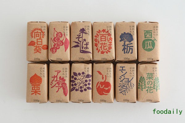 牛皮纸里包着小巧的瓶子,竖条长方体,印着不同颜色的花纹,远看像是一种糕点。外部包装的方形纸盒,也是在传统食物中常见的。仔细看过去,包装纸的里面还有密集的文字,外面也是用刻章的方式印出来,这样古朴传统的包装给人以踏实而熟悉的感受,没有特点的瓶子也变得很纯粹。契合了宣传所称“纯粹天然”。这个系列由日本设计机构 Akaoni Design 设计。他们设计的食物包装常常还原出手工感。