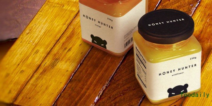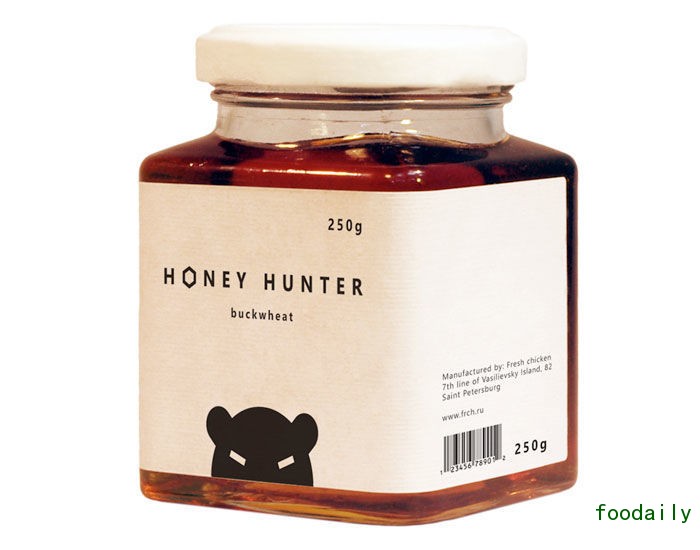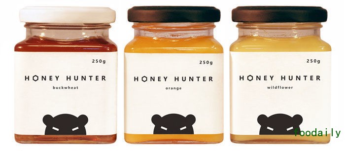 维尼熊和它的蜂蜜是经典搭配,也有设计利用了这个组合。然而 Fresh Chicken Agency 描绘的故事没有那么友善,露出半个脑袋的黑熊在一旁窥伺,企图偷走这瓶蜂蜜,所以称它为“ honey hunter ”。相应的,大面积的瓶身被白色的包装纸包裹了起来,只留下少量的黄色蜂蜜,给予无限想象和窥探的空间。不管怎样,有故事的设计总是充满了趣味性。