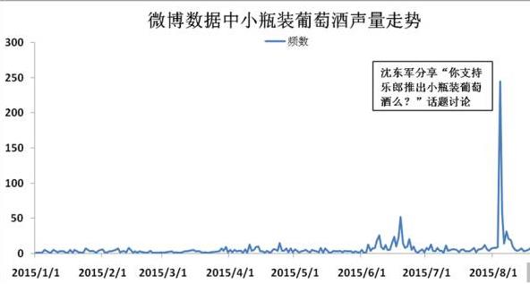 在新闻资讯和微信数据中我们可以看出,媒体对小瓶酒是持续关注的,曝光内容中27.36%主要集中在小瓶酒深受消费者青睐,但也有12.75%的声音认为,小瓶装葡萄酒在国内市场难成主流。在微博中,沈东军分享的微博“你支持乐郎推出小瓶装葡萄酒么?”带动了网友的积极性,将小瓶酒的讨论推向了高潮。