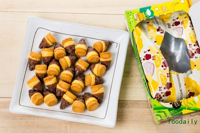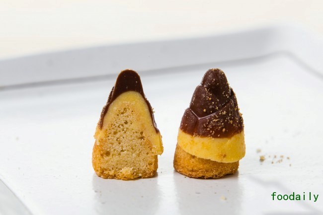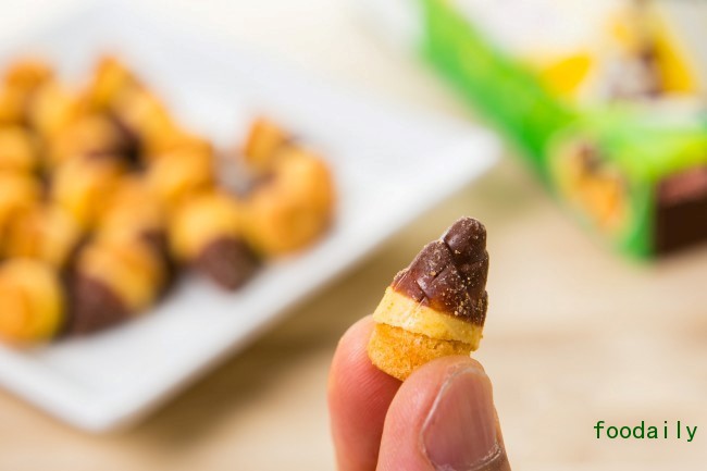 乍一看,你就会被这个小点心的外形给吸引,像极了可爱的小竹笋。它的内层是酥脆的饼干层,与竹笋的松脆质地非常相似,外层是黑色的牛奶巧克力,中间多了一层黄色的香蕉巧克力,就像竹笋硬硬的外皮,非常形象。