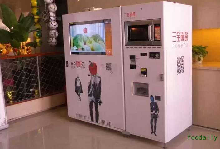 三全鲜食的模式为 APP(手机预订软件)+FUNBOX 智能午餐贩卖机 + 中央厨房。中央厨房统一生产盒饭,然后通过冷链物流配送到午餐贩卖机。用户通过 APP 购买盒饭,然后在附近的贩卖机取餐。
