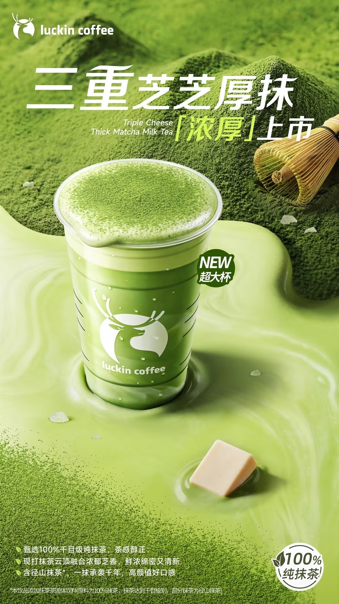 3月23日,瑞幸咖啡上新「三重芝芝厚抹」。据官方介绍,新品选用100%千目级纯抹茶,搭配现打抹茶芝士云顶,并撒有抹茶粉,口感清香绵密。目前。新品已上架瑞幸咖啡官方小程序,售价为35元/大杯。(来源:瑞幸咖啡)原文链接