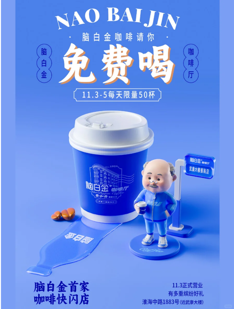 11月1日,脑白金官宣首家咖啡快闪店于11月3日正式开张,首店落地上海,联合武康大楼邮局店共同打造,地址位于淮海中路1883号。开业前三天还有限量免费脑白金咖啡和多款周边相送。原文链接