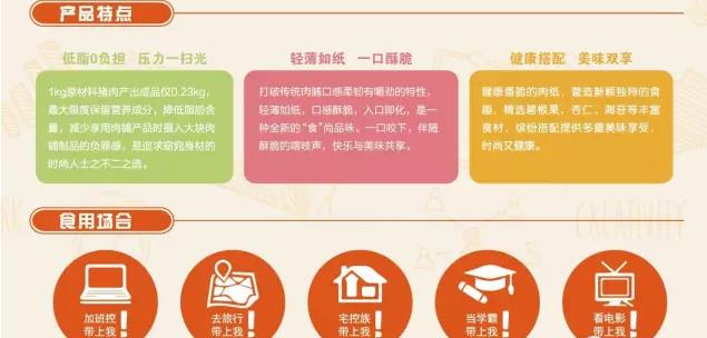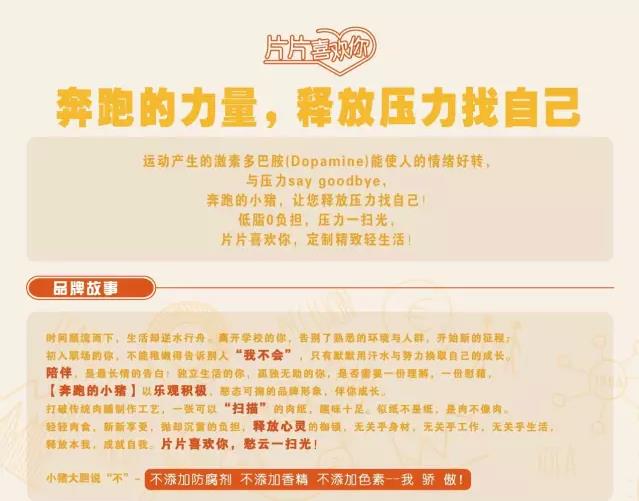 “轻、薄、透、脆、料”是“奔跑的小猪”产品卖点:轻:健康低负担,精致轻生活;薄:轻如纸、薄如翼、引领新食尚;透:透若蚕衣,食之有趣;脆:一口酥脆 欢乐加倍;料:健康搭配 美味双享。