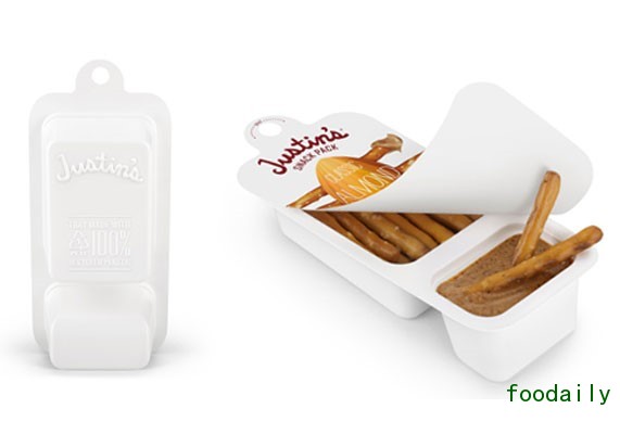科罗拉多Boulder的Justin公司最近推出了带有巧克力榛子或者杏仁酱的无麸质椒盐脆饼干零食包,用100%可再生塑料包装。该公司与包装开发商Placon合作,用消费过的PET塑料,也就是被丢弃的塑料创造了包装容器。