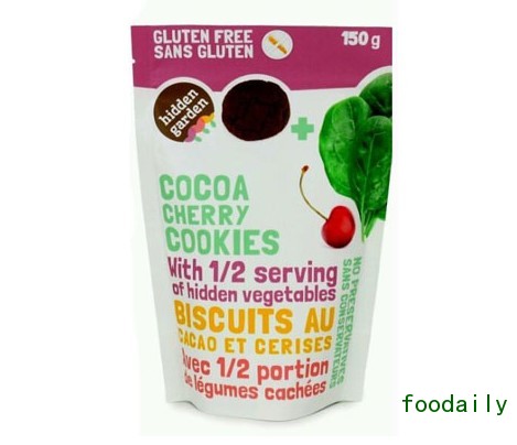 一些品牌将花椰菜,冬南瓜和甜菜根引入包装食品中,秘密地增加营养。来自温哥华本拿比的Hidden Garden Foods制成了含有少量蔬菜的无麸质曲奇。有用甜菜根制作的红天鹅绒风味,用冬南瓜制作的姜饼,用南瓜制作的巧克力脆片。该品牌的最新品种是用菠菜制作的可可樱桃曲奇。