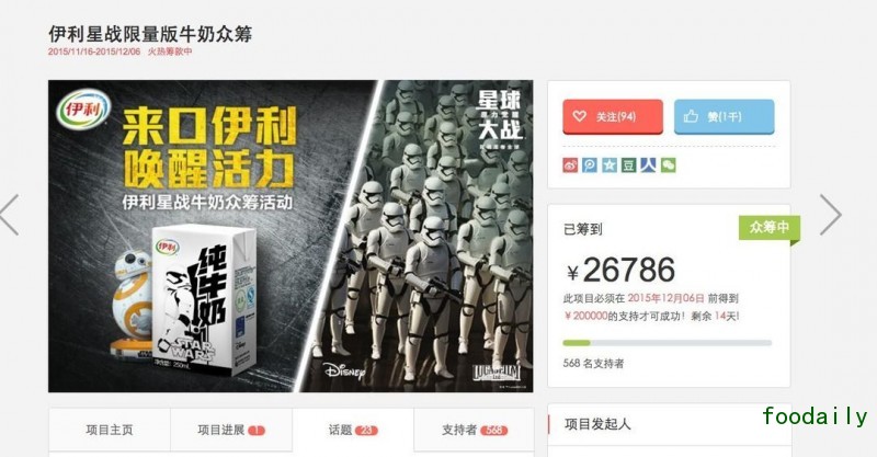 最近和百事手机一样亲近众筹平台的,还有一个伊利牛奶。从 11 月 16 日到 12 月 6 日,它在京东众筹上发起了一个星战限量版牛奶的众筹。但它的情况就要差一些,目前只累计了 2.6 万元。