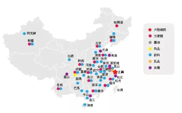 目前,统一在大陆地区设有东北、华北、中原、华中、华东、华南、大西部、新疆等8大区域。旗下包括统一亚洲控股有限公司、统一企业(中国)投资有限公司、广州统一企业有限公司等46家分公司,除西藏青海其余各省均有建厂,足迹遍布中国大江南北。