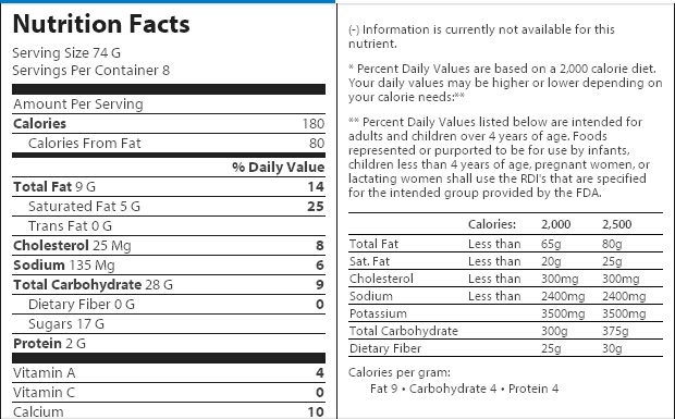原料:牛奶,奶油,脱脂牛奶,糖,玉米糖浆,未漂白的面粉(小麦粉、尼克酸、铁,维生素B1硝酸硫胺[ ] [ ]维生素B2核黄素,叶酸)、棕榈和/或油菜和/或大豆油、乳清粉、可可粉(用碱处理)、高果糖玉米糖浆、玉米淀粉、单、双甘油酯、苏打粉、纤维素胶、卡拉胶、丙二醇单酯、硫酸钙、瓜尔豆胶、天然和人工香料,盐,大豆卵磷脂,香兰素,巧克力。