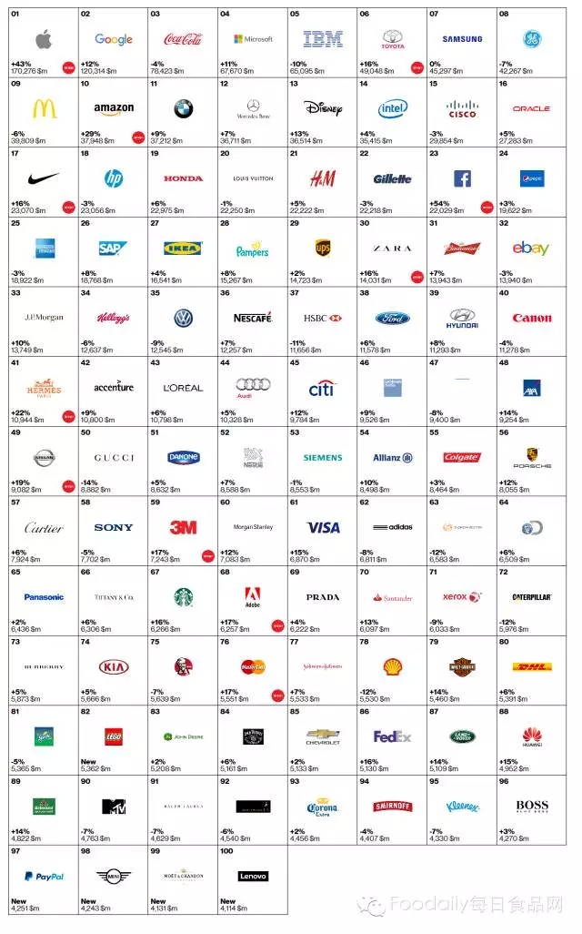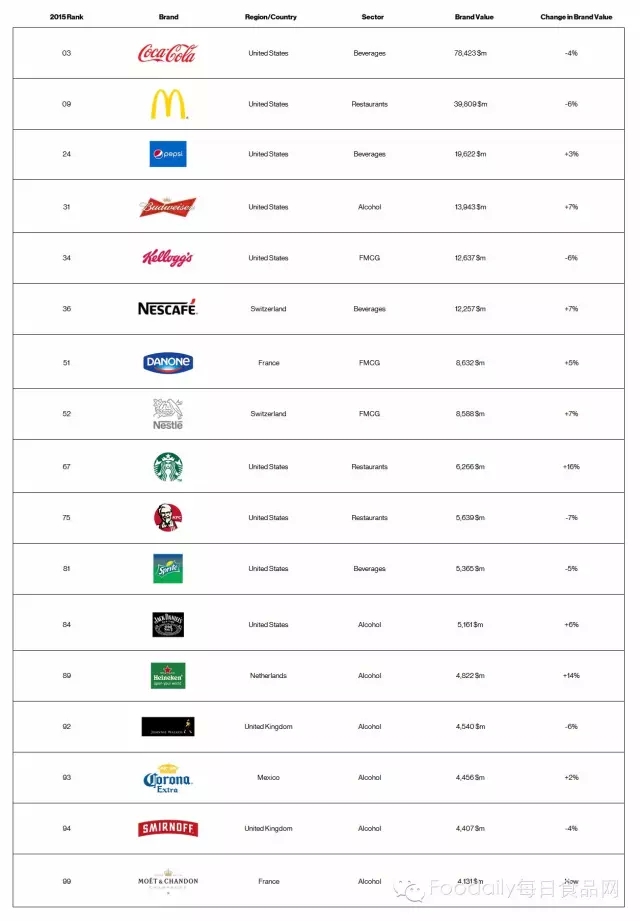 Interbrand数据显示,入选的食品&饮料品牌如下: