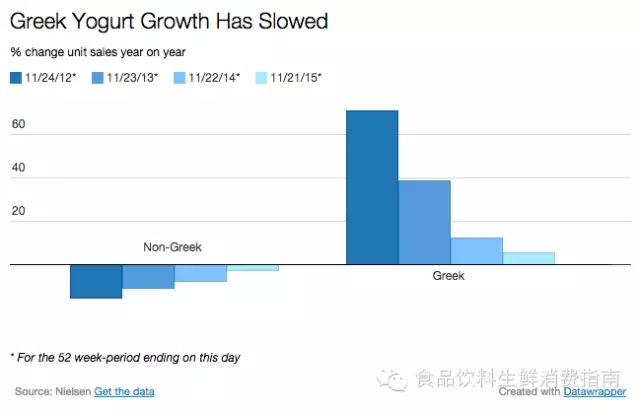 根据尼尔森市场数据,希腊酸奶的市场业绩增长已经明显放缓,截止到2015年11月21日,增长速度已经从前两年的双位数降低到目前的5.5%,同时尼尔森也指出,放缓的原因很大程度上与希腊酸奶的新品创新有关联,而非希腊品种则要好很多。
