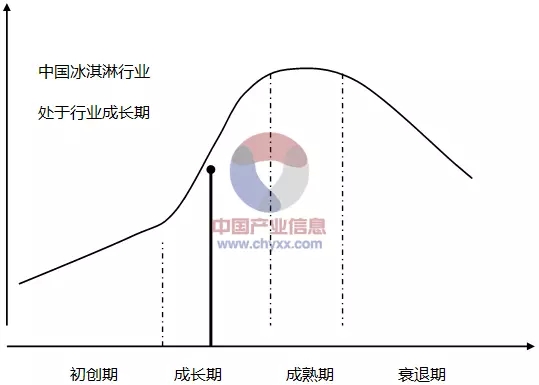 近几年我国冰淇淋行业增长速度在15%以上,处于行业发展成长期阶段。