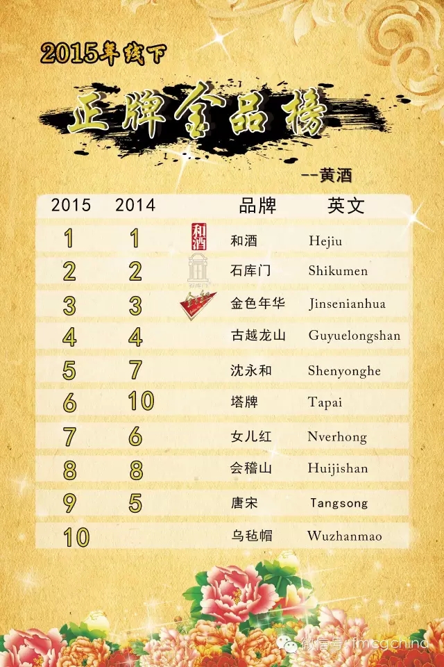 金枫酒业旗下和酒、石库门和金色年华依旧霸占2015年度线下黄酒金品榜前三甲,但是金枫酒业前三季报中营业利润下滑10.3%,净利润更是下降17.6%。绍兴古越龙山秉持纯正绍兴酒特色,旗下古越龙山、沈永和和女儿红品牌入榜。古越龙山品牌紧随三甲排在第四位,而沈永和则跃升至第五位,女儿红排在第七位。另外,塔牌从第十位前进至第六位,而唐宋则下滑至第九位。乌毡帽新入榜排在第十位。
