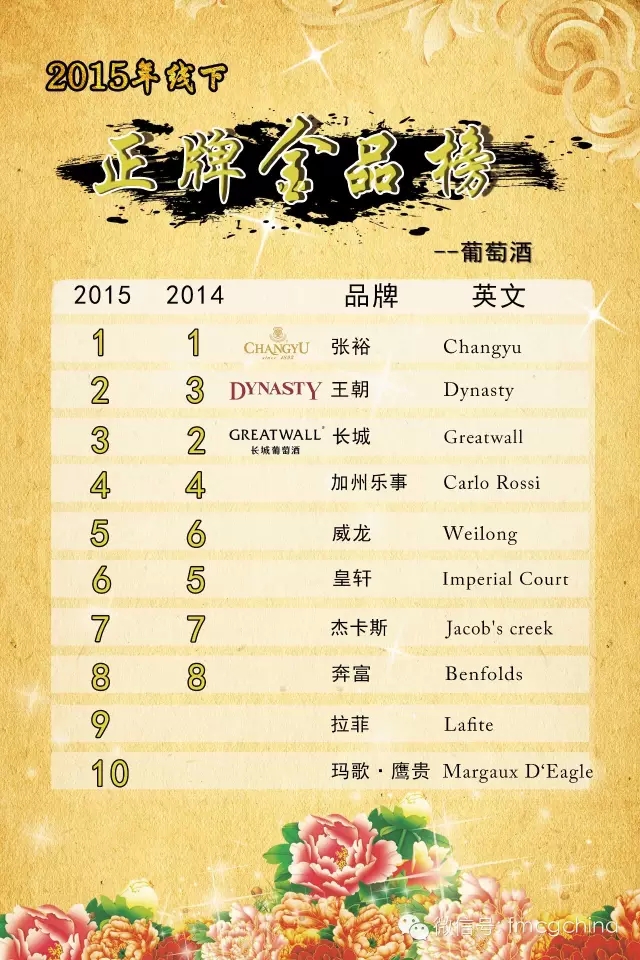 张裕以近三成的市占继续领跑葡萄酒行业。王朝力压长城夺得第二位,长城屈居第三。南浦旗下的加州乐事和皇轩分列第四和第六位。威龙上升一位排在第五的位置。拉菲和玛歌·鹰贵新进入榜,分列第九和第十位。