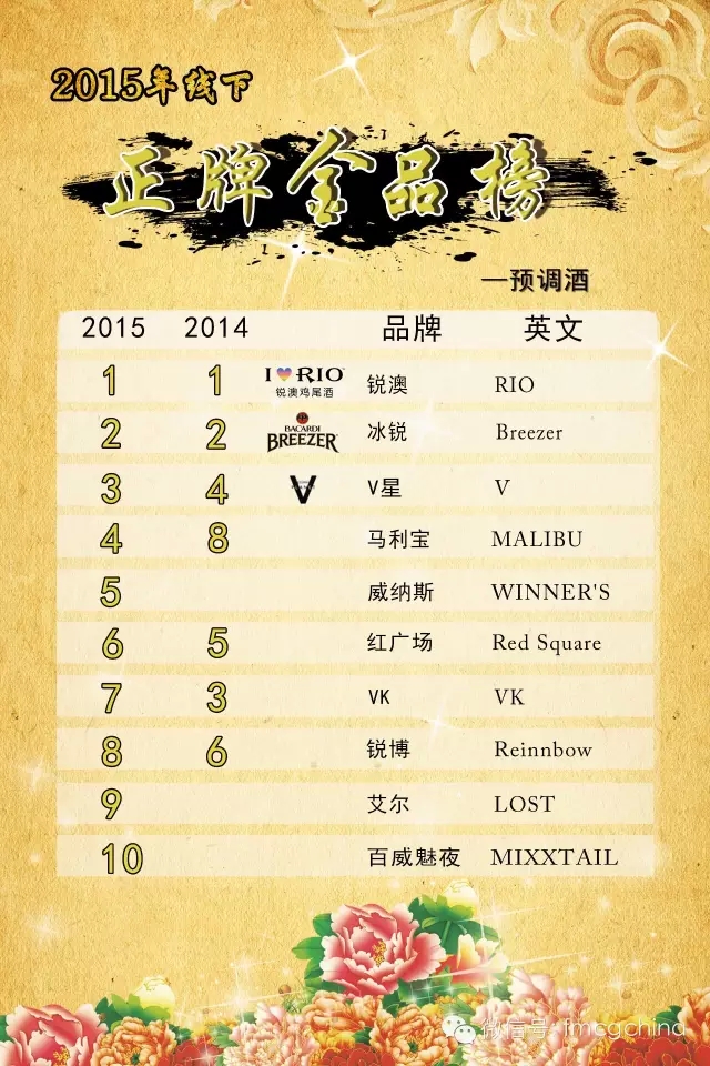 2015年预调酒市场竞争日趋激烈,许多新品牌不断涌入。锐澳和冰锐继续蝉联2015线下金品榜前两位,然而两大品牌的市占都出现较大下滑,锐澳三季度的利润下滑以及渠道库存严重积压都似乎预示着预调酒增速正在逐步放缓。天喔推出的V星切入三甲,市场反响不错。马利宝和新入榜的威纳斯分列第四和第五位,红广场下滑一位排名第六。而百威新品魅夜系列2015新进入榜单,排名第十位。