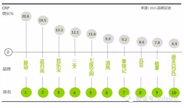 在2015中国品牌足迹排行榜中,达能集团旗下的品牌脉动排名上升最快。消费者触及数同比增长20%,去年新增790万城市家庭。凭借近年来对品牌“日需饮用”的持续宣传,以及稳健的区域拓展策略,脉动在2014年一跃成为前50位品牌中排名中上升最快的品牌。此外, 中国品牌蓝月亮、君乐宝、三全和七度空间分别入围消费者触及数增长最快的前五强。