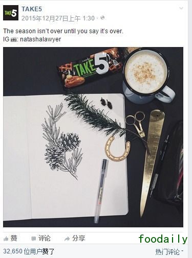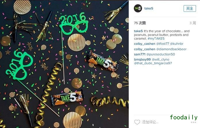 于是,好时加大了 Take 5 的产量,现在在美国的路边杂货店也能买到了。 Take 5 换了亮眼的新包装,也终于有了专属于自己的 Instagram 、Facebook 、Twitter 、Tumblr 页面。跟以前的包装相比,Take 5 的新包装更加年轻,而且把 5 种配料都呈现在包装上,显得更加诱人。社交网络推广明显走的年轻化路线,图文色彩明丽,还带着点儿酷酷的劲头。