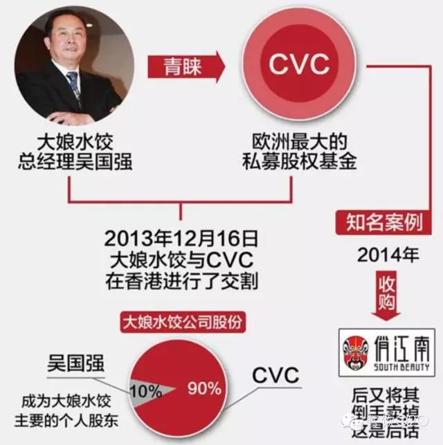 “(它是)欧洲最大的私募基金。”在回答为什么选择CVC时,吴国强这样向记者表示。2013年12月,CVC完成了对大娘水饺收购,成为其控股股东。目前,CVC持有大娘水饺90%的股份。