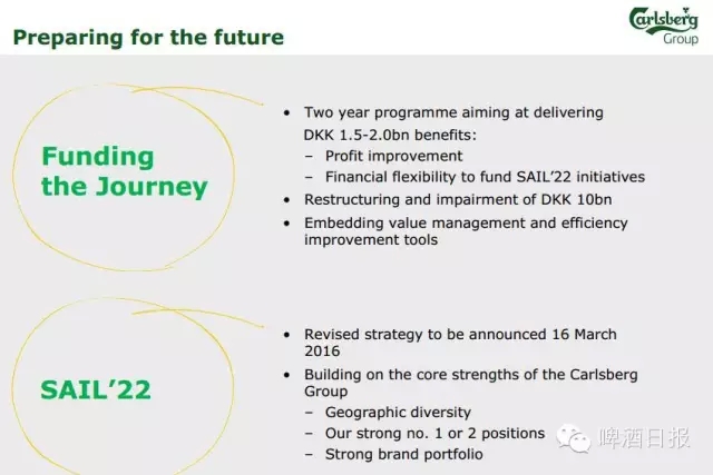嘉士伯CEO Cees 't Hart一上来就把2015年定调为“转型年”,而嘉士伯的“转型”还将持续几年。具体来说,公司去年提出了两项战略举措。一方面,通过“‘资’援新征程”(Funding the Journey)项目,提升运营效率;另一方面,战略性地重新审视业务,并总结成为“起航2022”(SAIL’ 22)。前者创造的净收益将投入到后者中。