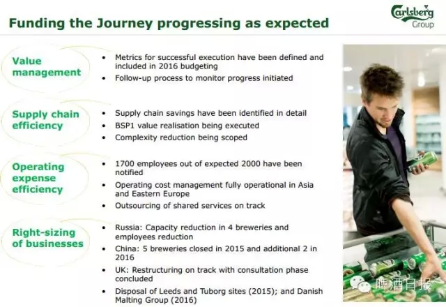 那么“‘资’援新征程”项目目前进展情况如何呢?据公司介绍,该项目分为四个支柱:价值管理、供应链效率、运营成本效率和调整业务规模。值得注意的是,嘉士伯在2015年关闭了5个中国酒厂,2016年还将继续关闭2个中国酒厂。