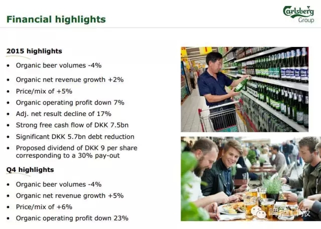 说了半天,终于要讲2015年业绩表现了。公司有机啤酒销量下降4%,有机净收入增长2%。好消息是公司的现金流变强了,达到75亿丹麦克朗。